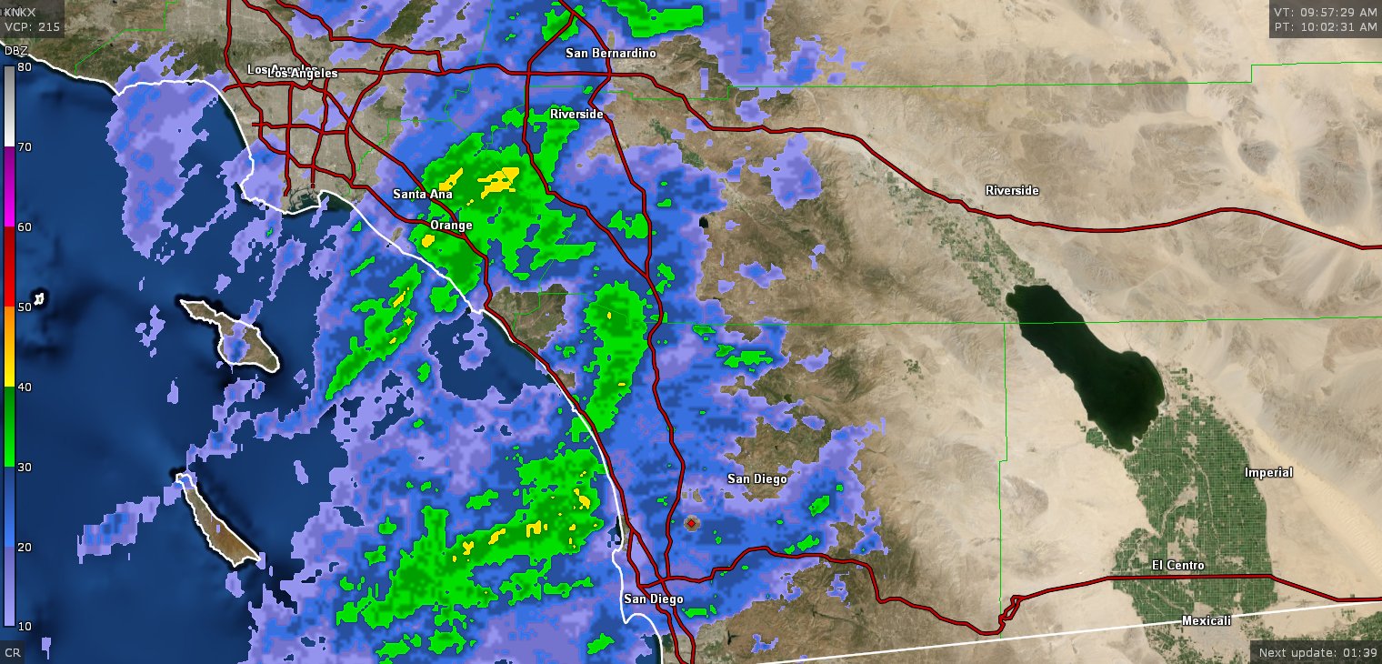 Northwest wind 10 to 15 mph with gusts as high as 25 mph. The live San Diego weather radar loop detects the movement of rain droplets and predicts the future position and the intensity of the precipitation. Weather doppler radar from CBS News 8 KFMB in San Diego California. Want to know what the weather is now.